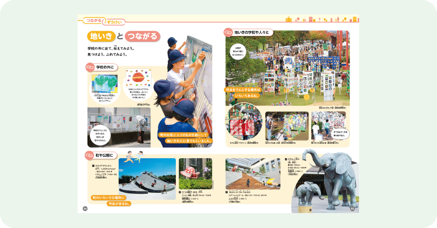 社會に開かれた教育課程を?qū)g現(xiàn)します。地域と連攜した活動、SDGsにかかわる內(nèi)容やインクルーシブな教育など、図畫工作を通して地域や社會とつながることができる學(xué)習(xí)內(nèi)容を設(shè)定しています。