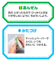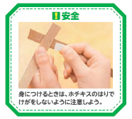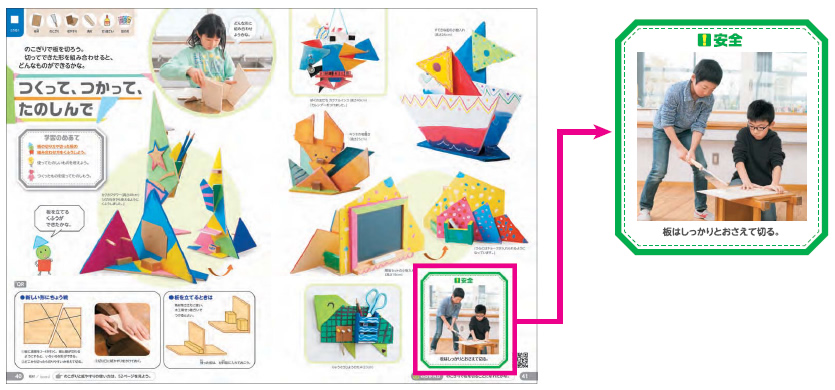 「造形の引き出し」で安全な用具の使い方を掲載するとともに、用具の使い方以外にも、各題材ページにおいて、配慮すべき內容を「あんぜん」「安全」の囲みを設けて具體的に示しました。