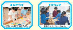あとかたづけも大事な活動です。安全指導にも直結するかたづけを囲みで目立つように示しました。 |
