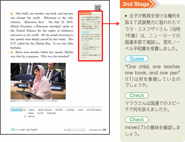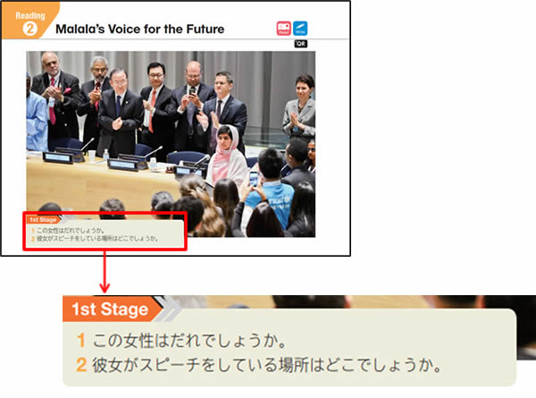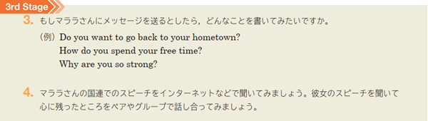 新しいSUNSHINEには,2年生に3つ,3年生に2つ(ほかにFurther Readingが2つ)Readingのプログラムがあります。Readingでは3つのStageごとに段階的な問いを用意しています。SUNSHINE 3のReading 2はMalala’s Voice for the Futureです。1st Stageでは次のようなPre-Readingとしての問いで,題材への興味?関心を持たせます。