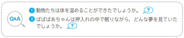 Q&Aは,Facts Finding型だけでなくInference型など,Thinkの本文の內容から推測して答える推量発問です。上記の2つの質問はどちらも,本文に明示的には書かれていません。だからこそ,ストーリーの因果関係など,深く読み込むことが求められます。