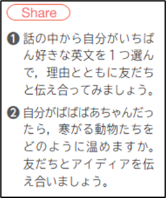 一方,本文の最後のセクションにあるのが上記Shareで,ここでは2種類のオープンクエスチョンが用意されています。答えは決して1つではないので,しっかりとした根拠があれば,正解はいくつも出てきます。自由に考えることができるので簡単なように見えますが,本文の中の具體的な箇所を根拠として示すことがポイントです。