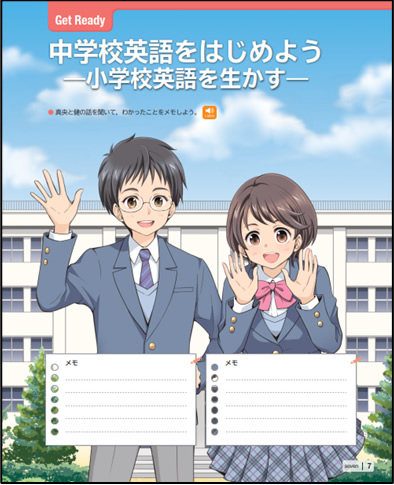 図1はGet Readyのとびらページです。ここでは,新SUNSHINEの主人公である真央と健が,生徒に向かって話しかけます。はじめに,真央が自己紹介をします。生徒は,聞き取れた內容をメモ欄に書き取ります。