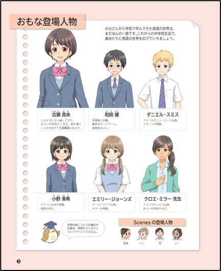 | Get Readyでは,新學期にふさわしい「自己紹介」というテーマのもと,新SUNSHINEの登場人物(図2)を介して,生徒は様々な活動に取り組みます。生徒は授業での活動を通して,真央や健をはじめ,エミリー,ダニエル,ミラー先生などの登場人物について知ることができます。本課のPROGRAM 1の學習が始まる前に,これから3年間,一緒に英語を勉強する教科書の中の仲間たちに対して,実在する友だちのように親しみをもってもらいたいと考えました。 | ![]() 図2:新SUNSHINEの仲間たち (1年 前見返しうら) |