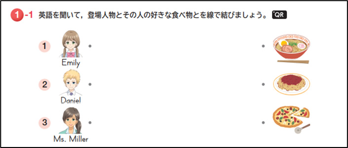Get Ready 2の①-1(図3)では,英語を聞いて,エミリー,ダニエル,ミラー先生とその人の好きな食べ物とを線で結びます。