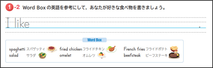 2の①-2(図4)では,生徒が好きな食べ物を4線に書きます。つづりがわからない生徒は,4線の下にあるWord Boxがサポートします。子どもに人気の高い食べ物のつづり,意味,イラストが示されているので,生徒はWord Boxを參考にして4線に書き寫すことができます。
