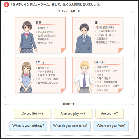 Get Ready 3の②(図5)では,小學校で親しんできた「なりきりインタビュー」でやり取りを行います。生徒がなりきる人物は,真央,健,エミリー,ダニエルの4人です。彼らのプロフィールカードをもとにして,お互いにだれかになりきって英語で質問をし合います。