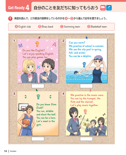 Get Readyはリスニングからスタートして,他技能の活動を統合的に取り入れるようにもしています。活動の形態は,生徒が小學校で経験して慣れ親しんでいるものです。ここでは,「聞くこと?書くこと?やり取り」と展開する例を紹介します。