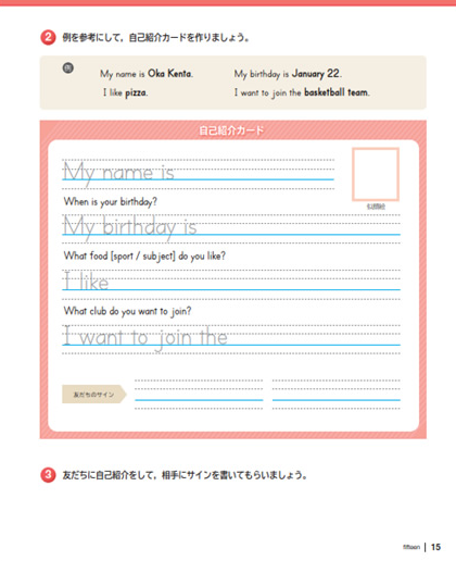 Get Ready 4では,生徒は文字を介して英語を使います。Get Ready 4の①(図6)では,新入生としてはたっぷりの量の英語を読みます。生徒は目に飛び込んできた英語の中から,理解できる語句をつなぎ合わせて回答することでしょう。4の②(図7)では,質問に答える形で自己紹介カードを書きます。4の③(図7)では,自分が書いた自己紹介カードを使って,友だちとお互いに自己紹介をしてサインを交換します。新しい友だちを作る,英語のクラス作りに生きる活動です。小學校英語では協働的,対話的な活動が數多く設定されているので,新SUNSHINEでも生徒どうしの教え合い,學び合いを大切にしています。