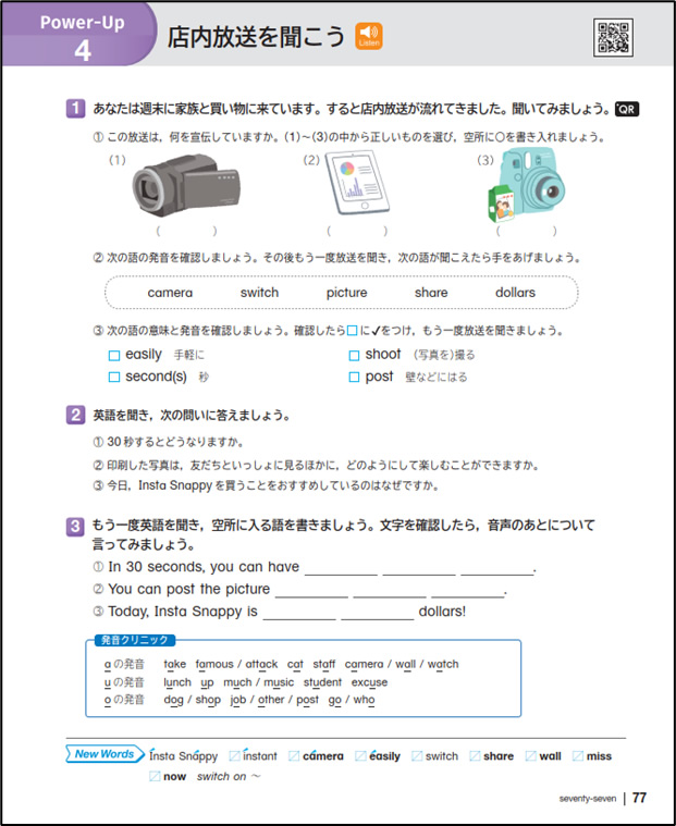 新SUNSHINEでは,現行版を引き継いだ各技能に特化したPower-Upというコミュニケーション活動があり,ここでもリスニングに特化したトレーニングができます。新SUNSHINE 1のPower-Up 4「店內放送を聞こう」(図8)を例に,リスニングの學習を見てみましょう。