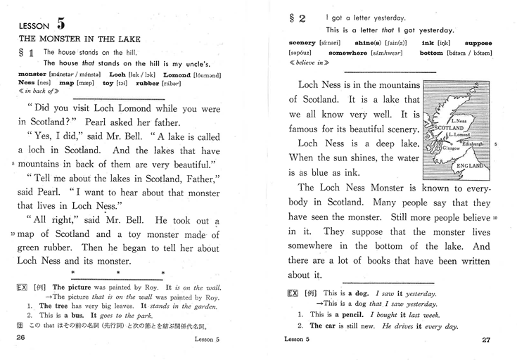 ネス湖の周辺にはお土産店も多く,関連のある出版物や玩具などをできるだけ沢山買い,ハンターさんが集めてくださった出版物なども一緒に郵送した。その結果は1968年出版のNew Prince Readers 3年生用Lesson 5にTHE MONSTER IN THE LAKEという題名で編集されている。當時ネッシーを実際に見たという湖畔ホテルの女性オーナーが居て,日本の朝日新聞にも1996年6月16日の社會面に「ネス湖に“泳ぐ物體”」という記事が掲載されて話題になり調査団まで派遣されたというので,教科書著者や使用している生徒さん達は喜んだことであろう。